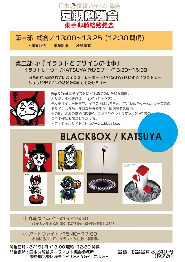 3/19(月)、似顔絵アーティスト協会の総会と勉強会を開催致しました。 遠方からお越しいただきました皆様、誠にありがとうございました。 総会では、来年度の勉強会と大会予定の発表、 勉強会では、イラストレーターのKATSUYA氏のセミナーと、作画、アー... -