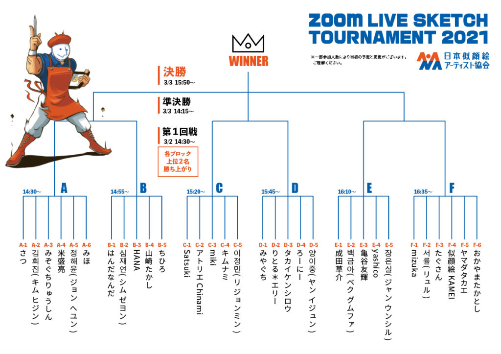 皆さま、こんにちは! 第1回ZOOMライブスケッチトーナメントの組合せ抽選会が先ほど行われました。 エントリーされた選手は、会員、一般、韓国似顔絵協会KOSCAメンバーから総勢32名! 1回戦6ブロックに分かれて優勝を目指します。 それでは気になる組合せ... -