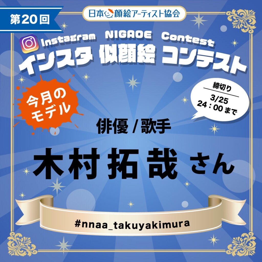 皆さん、こんにちは! 2023年3月に行われた、第20回インスタ似顔絵コンテストの結果をお知らせいたします。 #nnaa_takuyakimura すべての投稿作品はコチラの↑リンクからご覧いただけます。(インスタグラム) 第20回審査委員長:田畑伴和さん @tomotabata ... -